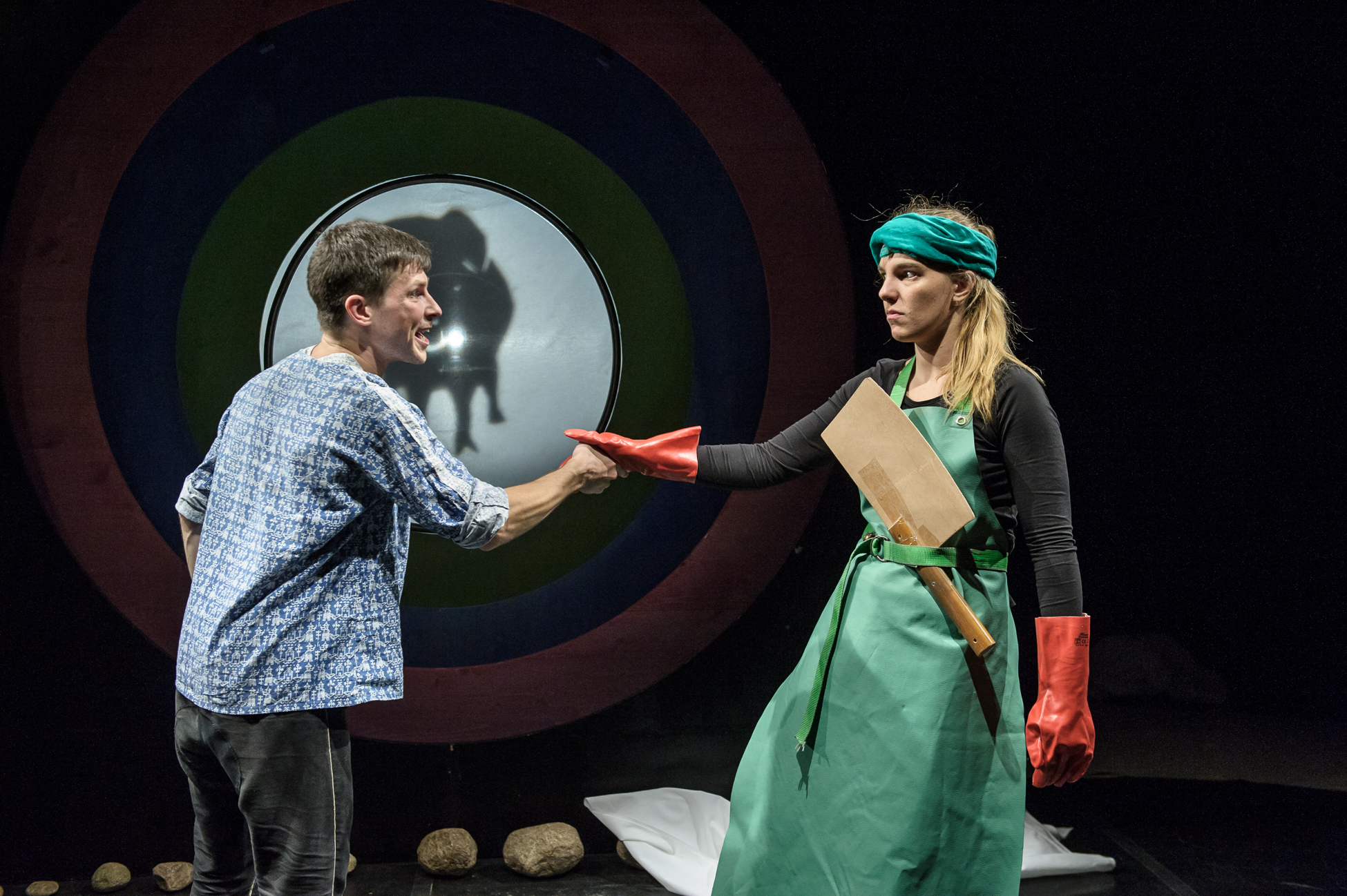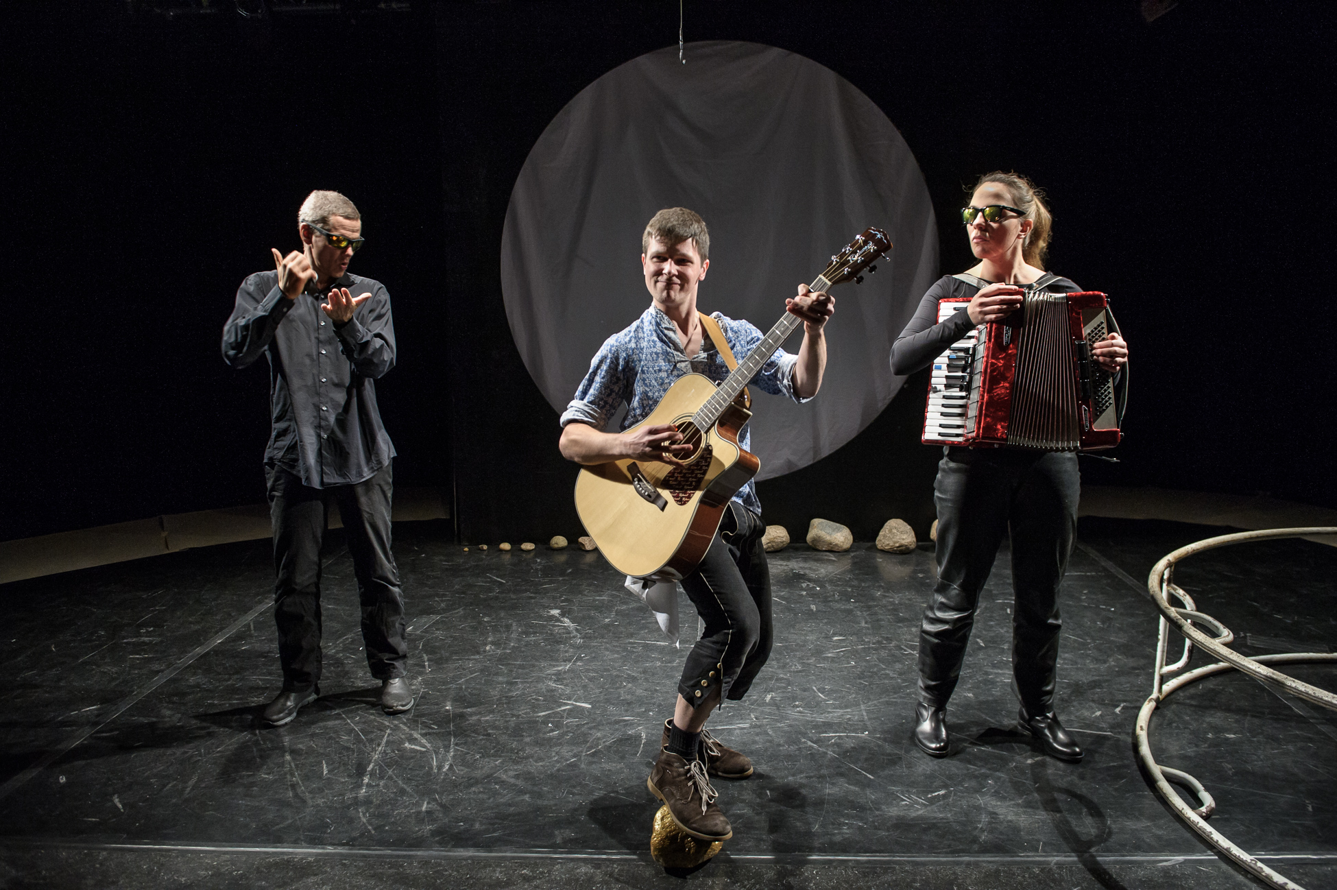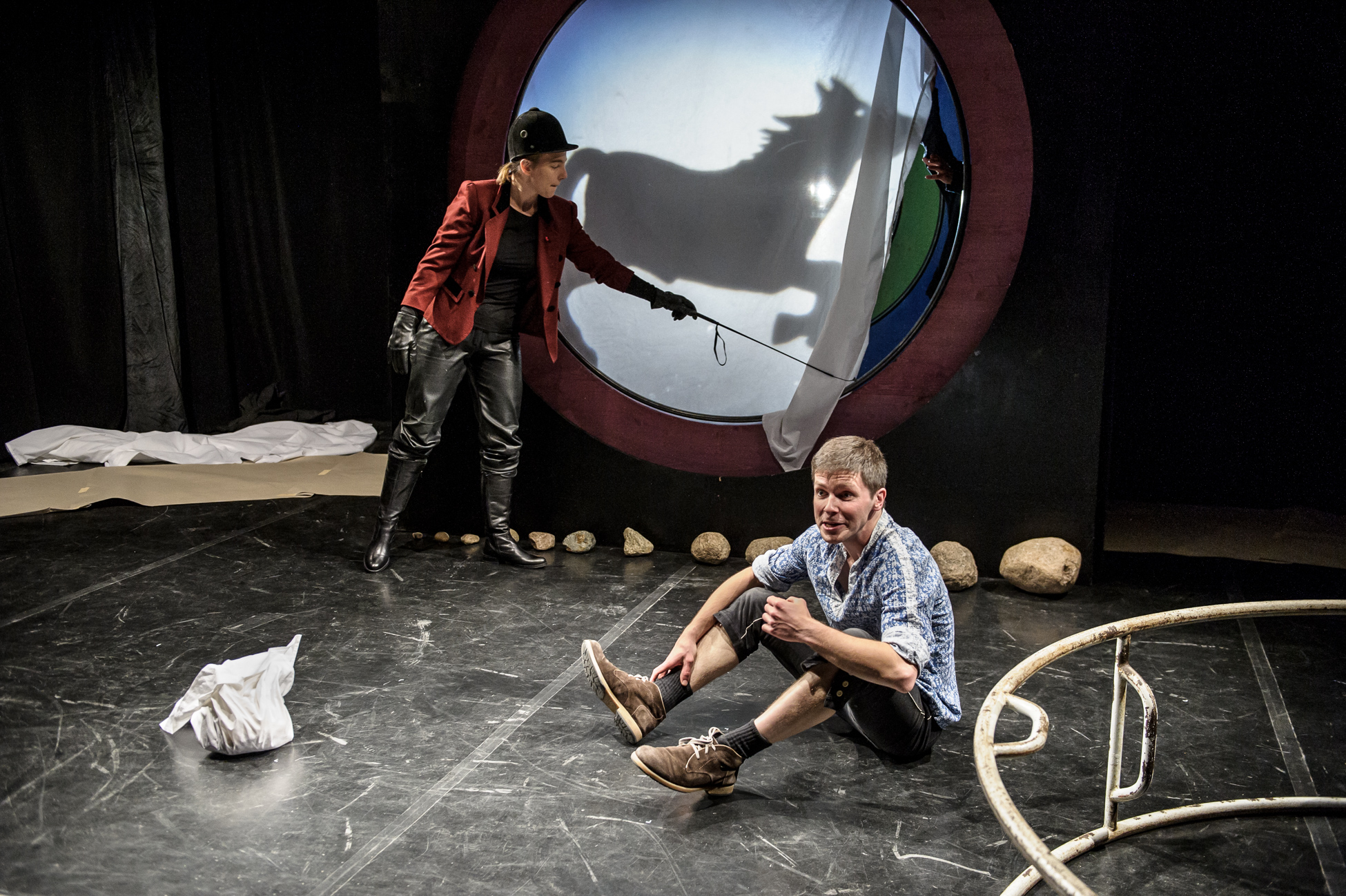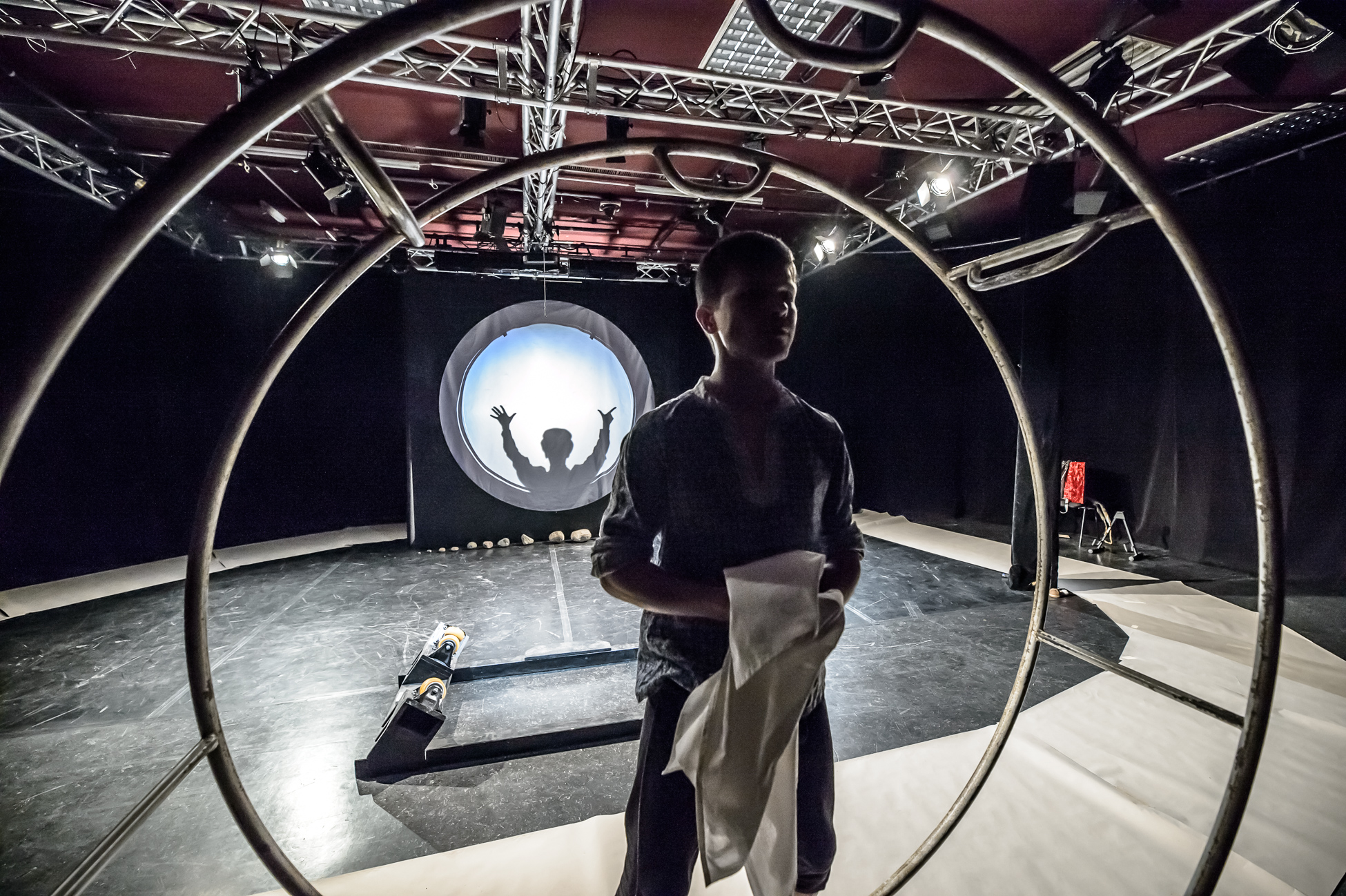 Hans startet in einem Rhönrad, das für den Lauf der Welt, aber auch das Glücksrad Fortunas stehen kann. Die Tiere werden durch runde, immer kleinere Metallringe symbolisiert, mit denen sich Hans und seine Tauschpartner*innen artistisch-spielerisch beschäftigen. Schattenrisse der eingetauschten Tiere stellen die Verbindung zu dieser symbolischen, die Fantasie anregenden Bühnenwelt her, in der das Rhönrad mal zu einem Wirtshaus, einem Brunnen oder einem Gefängnis wird und die ‚Ratgeber’ in weitere Rollen wie Bauer oder Gänsehirt schlüpfen. Wie die Voraufführung für Schulklassen eindrucksvoll gezeigt hat, steigen Kinder äußerst schnell in die Geschichte ein und diskutieren auch über ihren eigenen Weg zum Glück.